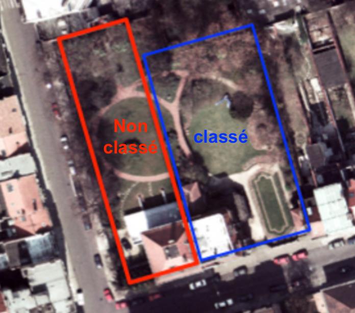 Photo Bruciel 1996 : en Bleu partie est du jardin classée - en rouge : partie ouest du jardin non classée, pour laquelle les riverains demandent la protection