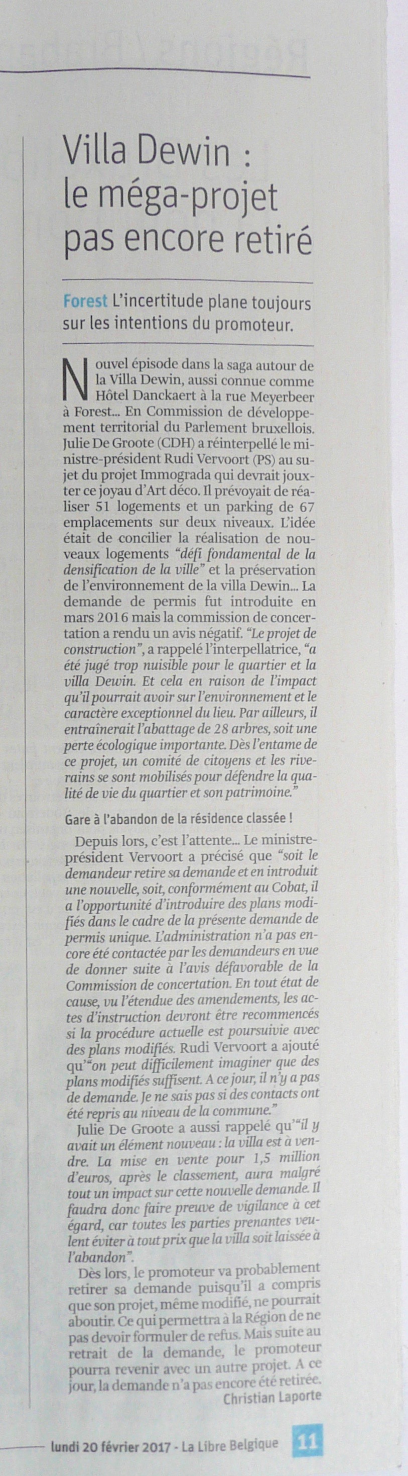 "Villa Dewin: le méga-projet pas encore retiré" par Ch.Laporte dans La Libre Belgique, 20/02/2017, p.11