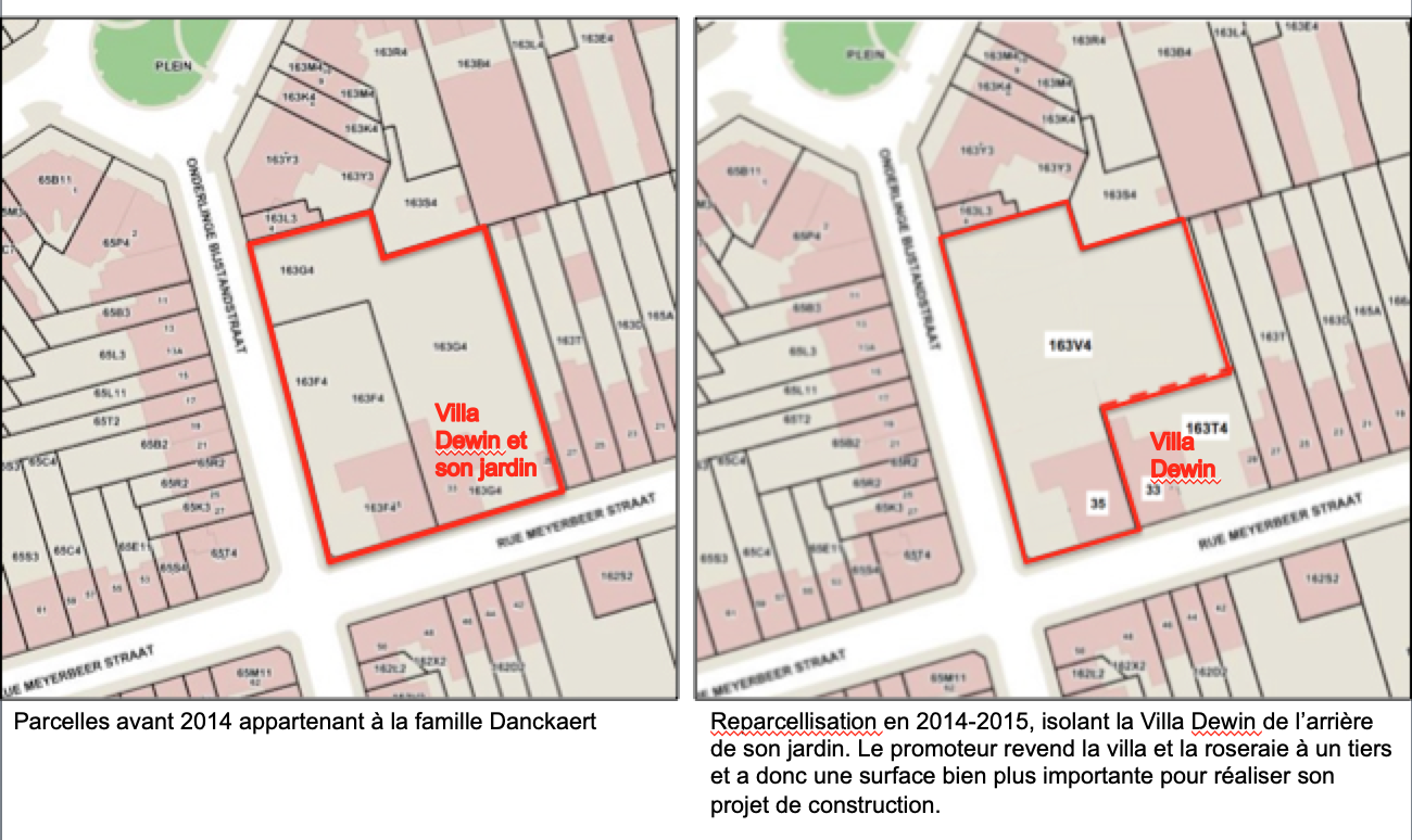 Trois mois seulement après le classement de la Villa et d'une partie de son jardin, une première demande de permis de bâtir dans la partie non classée du jardin est déposée par la Société gantoise Immograda à la Région, propriétaire du n°35 rue Meyerbeer et de la partie classée du jardin Dewin. Suite à une mobilisation citoyenne hors pair, la Commission de concertation rend un avis défavorable unanime, poussant le promoteur à retirer sa demande.