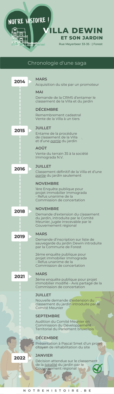En 2014, la Commission Royale des Monuments et Sites (CRMS) a proposé le classement de la Villa Art Déco de l’architecte Jean-Baptiste Dewin - Hôtel Danckaert- située rue Meyerbeer 33 à Forest et de l'ensemble du jardin qui s’étendait à l’origine jusqu’à la rue de la Mutualité. Les citoyens se mobilisent pour soutenir la proposition de la CRMS de classer la villa et l'entièreté de son jardin, via une campagne baptisée "NotreHistoire" et une pétition de 2000 signatures. Cette même année, le site a été racheté par un promoteur qui a reparcellisé le terrain et veut bâtir la partie non classée du jardin.